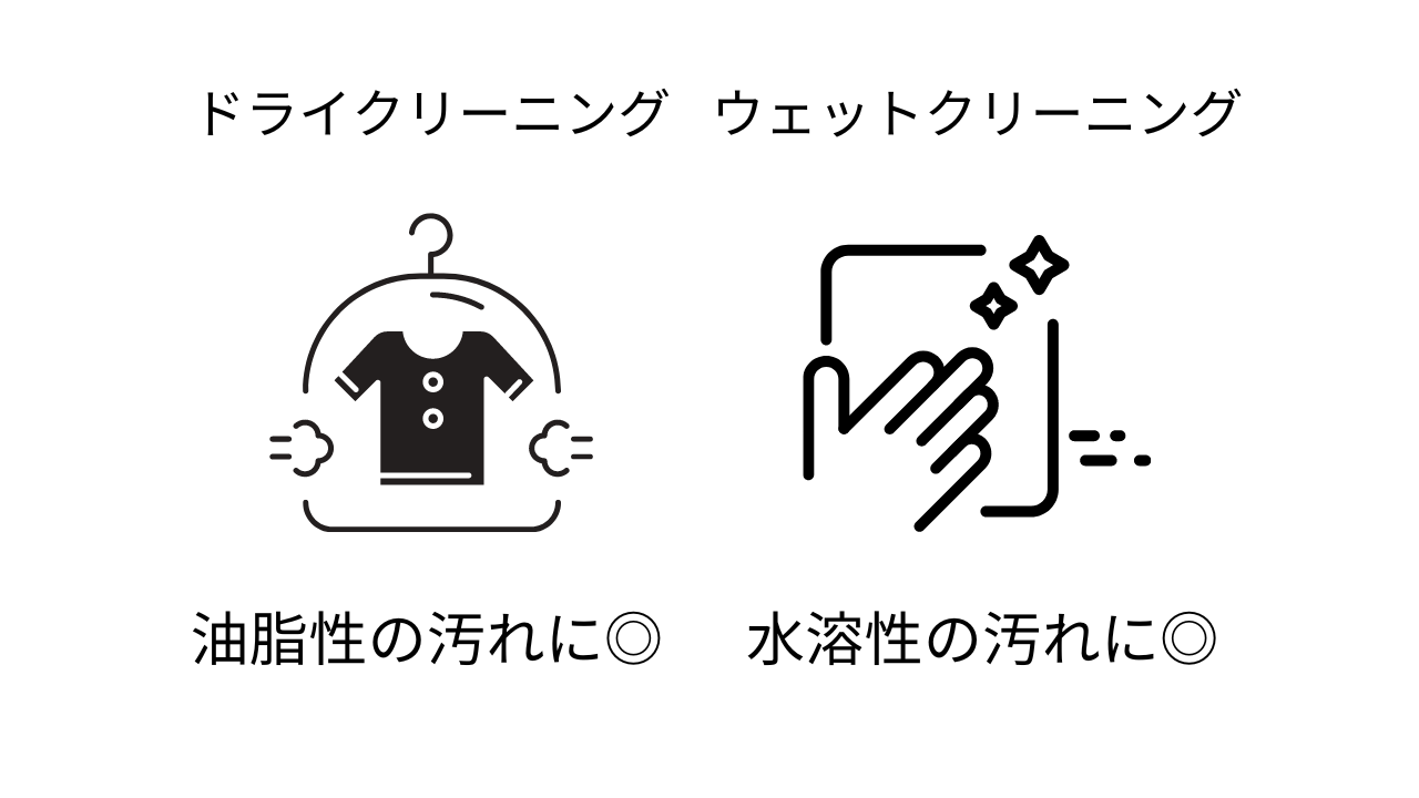 ウェットクリーニングは、本来ドライクリーニングで洗浄すべき衣類を、水と専用洗剤を使用して洗浄する方法です。こちらの方法は、ドライクリーニングに比べて、水溶性の汚れ(汗じみや食べこぼしによるシミなど)が落ちやすかったり、消臭効果が期待できたりといったメリットがあります。